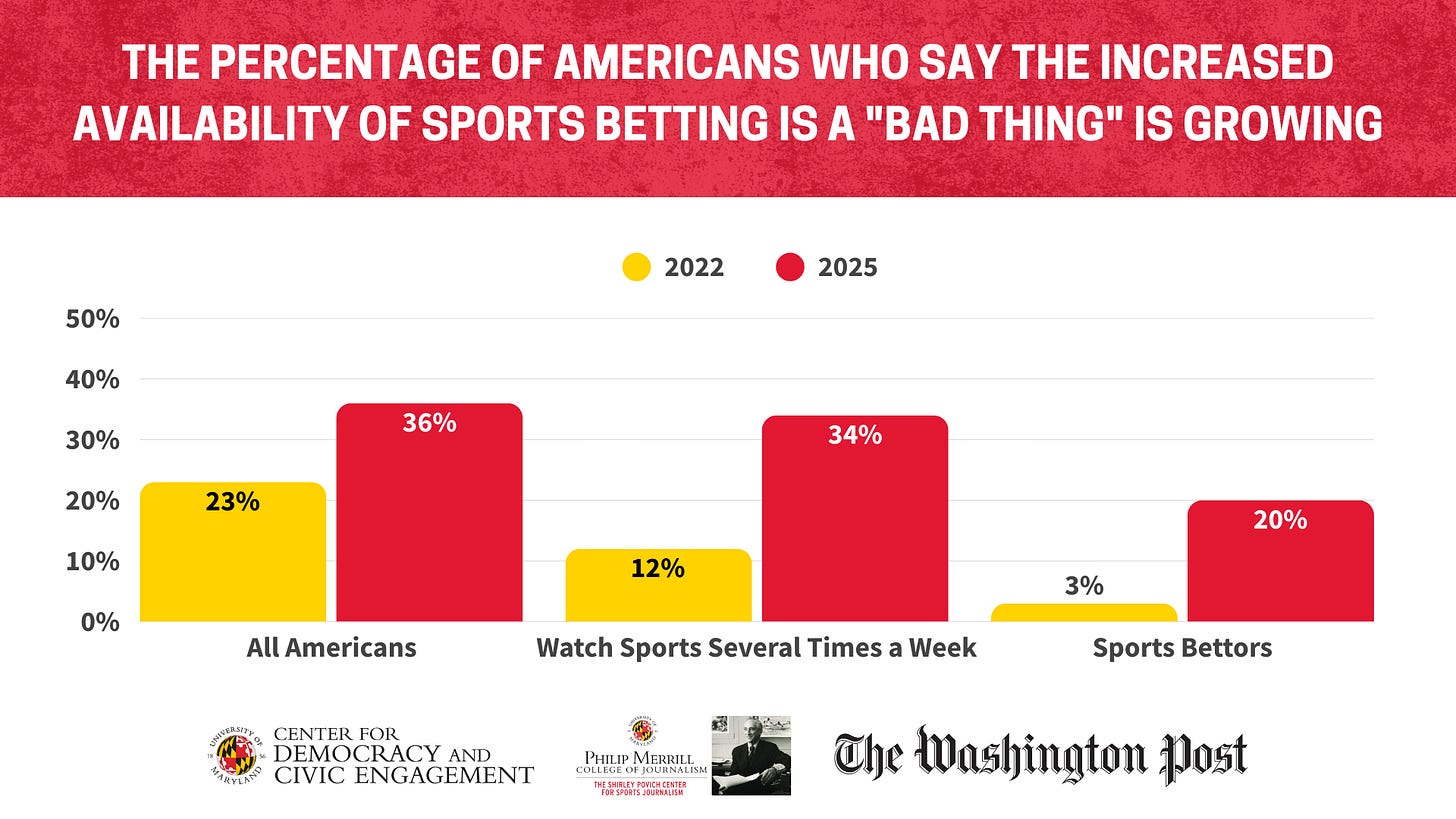 1Headline at the time: Support for legal sports betting grows, Post-UMD poll finds (July 7, 2022). Compare that to the headline for The Washington Post article about this poll Poll shows Americans’ growing concern over influence of sports gambling (December 15, 2025).